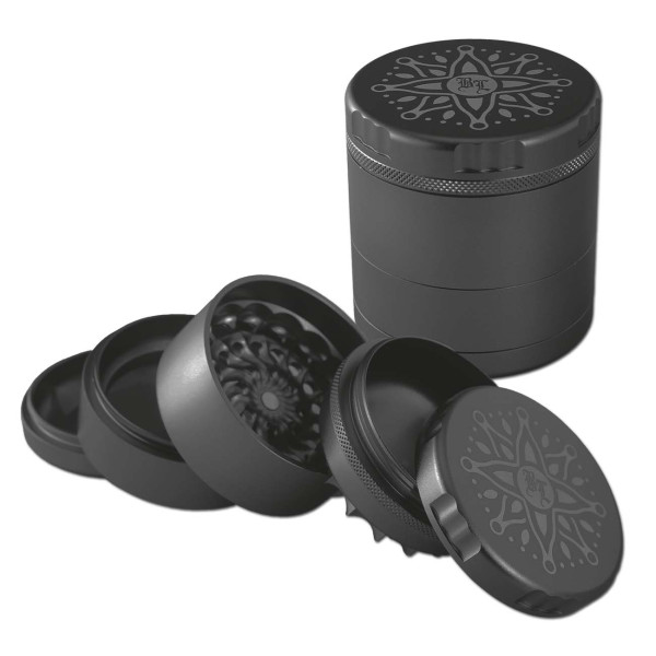 Der 5-teilige FLOWER-Grinder von Black Leaf® hat - wie der Masher (Art. 4302167) - keine Mahlzähne, sondern grindet das Mahlmaterial besonders gleichmäßig mit Druck in dem Mahlwerk mit dem blumenförmigen Wellenmuster. Direkt unter dem Deckel befindet sich bei diesem Grinder aus hochwertigem Aluminium eine größere Aufbewahrungskammer, so dass das obere Teil der Mühle genug Druck für den Mahlvorgang ausüben kann.