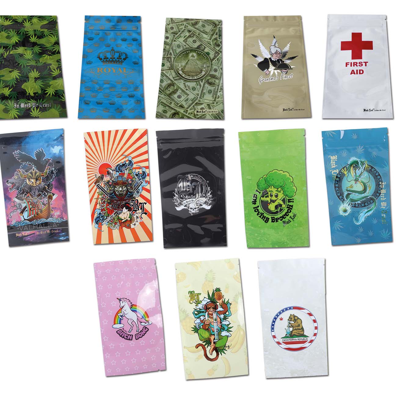 Verschließbare Druckverschlussbeutel aus einer metallisierten, reißfesten Polyesterfolie. Bedruckt mit einer Auswahl unserer coolsten Black Leaf®-Motive.