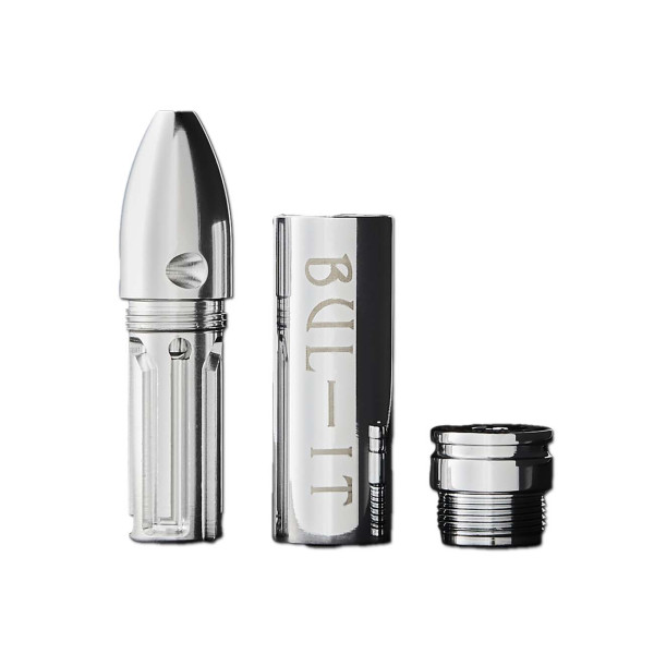 Super-coole Purpfeife aus zum Teil verchromten Flugzeugaluminium von RED-EYE in Form einer Patronenhülse. Im Inneren befindet sich ein ausgeklügeltes Labyrinthsystem, wodurch ein 360 mm langer Rauchweg entsteht. Auf diesem langen Weg (der um ein Vielfaches länger als die Pfeife selbst ist) durch das coole Metall, kann der Rauch super runterkühlen und wird dabei gefiltert. So ist der Geschmack besonders smooth.
